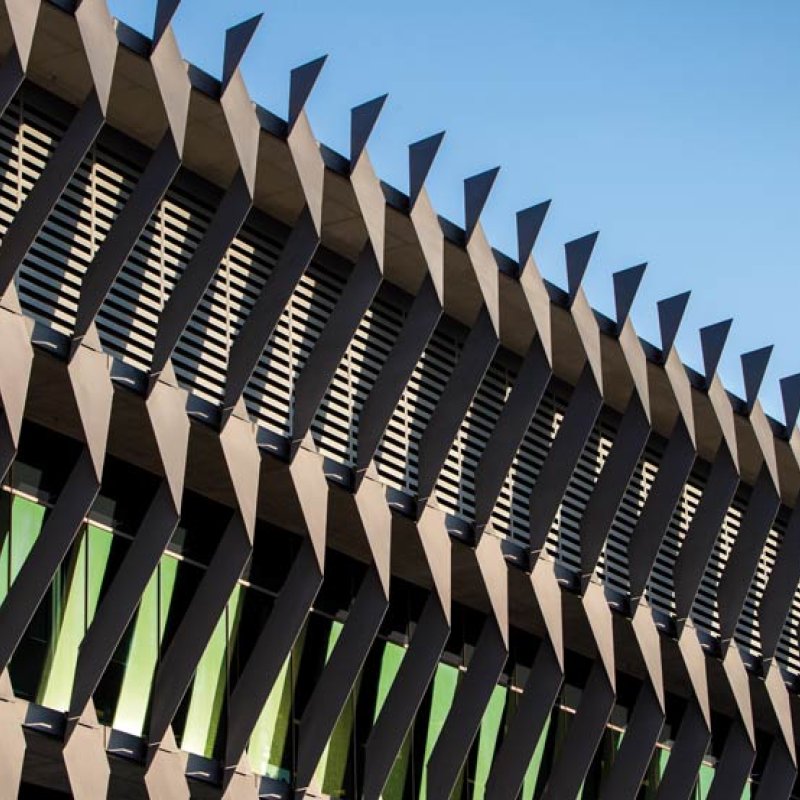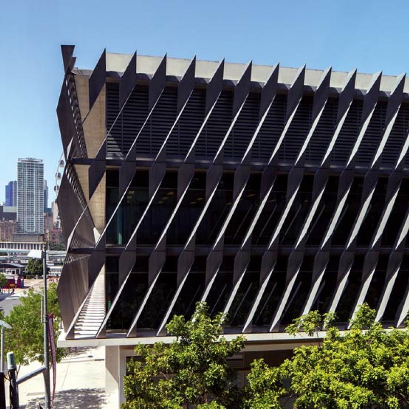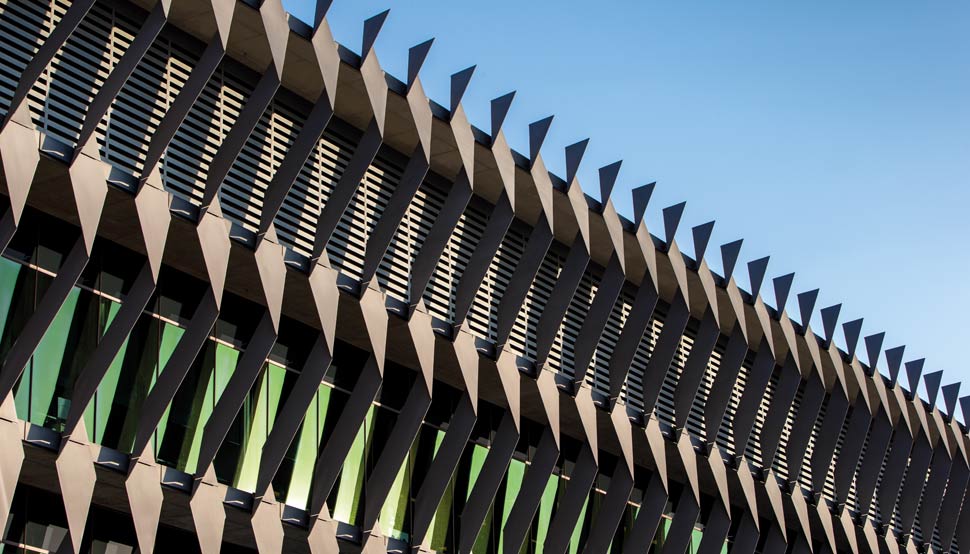 Along the northern and western elevations – the “second” street address – a striking pattern of blades made from 10mm high-tensile XLERPLATE® grade 350 BlueScope steel gives the building its strong identity and has inspired its nickname: the “Alessi cheese grater”. The moniker, true to a characteristic Australian humour that combines sledging with perspicacity, aptly tags their practical application as much as their stylish elegance
