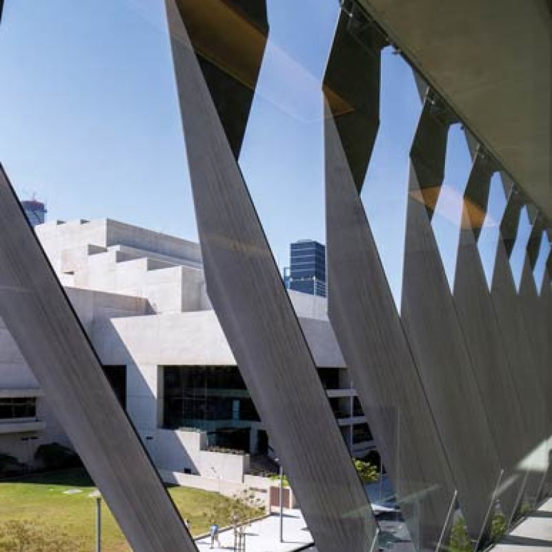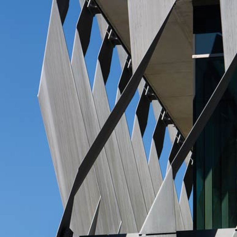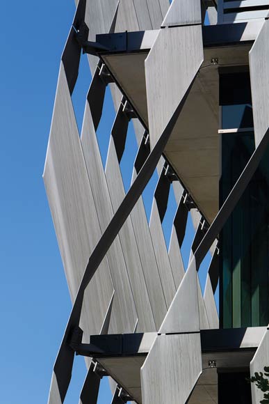 The blades, which recall the bends and tilts of the many surfaces in the building designed to deflect sound, also act practically as sunshades. In-situ post-tensioned concrete floor slabs project beyond the facade to assist in shading and provide the bases for attaching the blades.