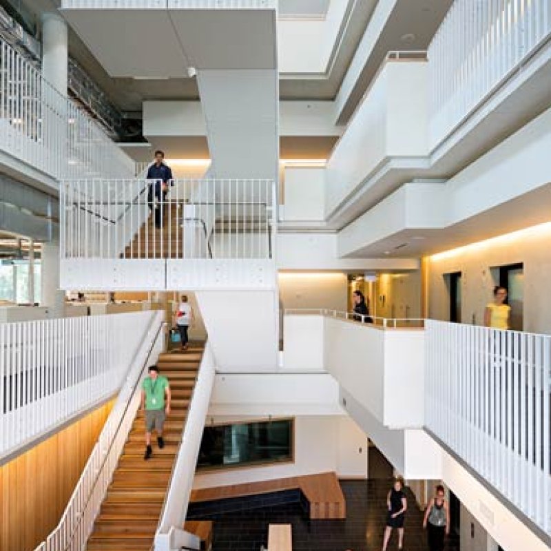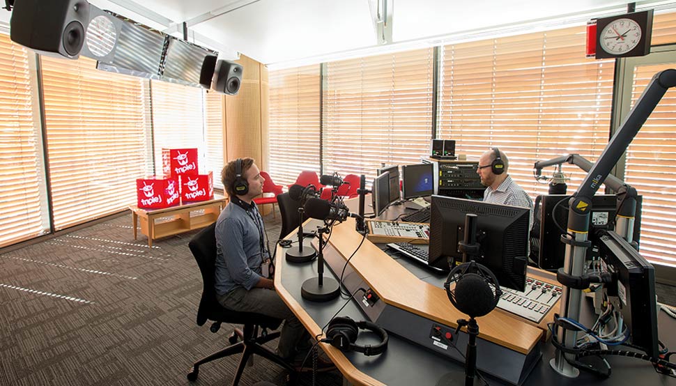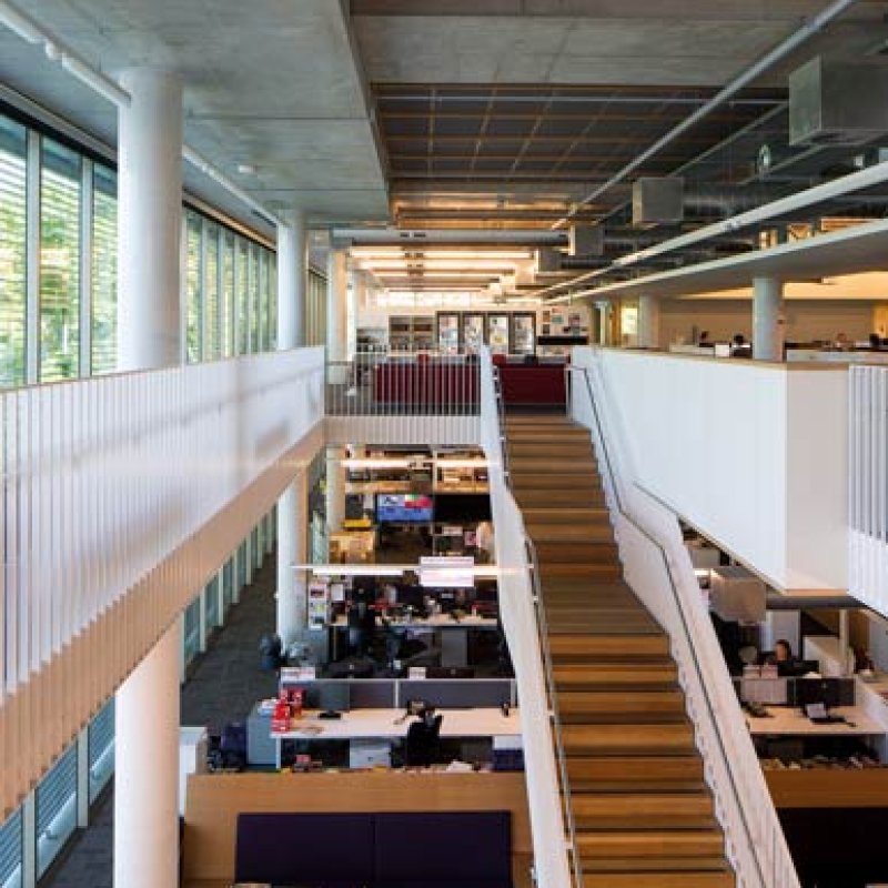 The three tiers of east-facing office space are visible from the Parklands through floor-to-ceiling glass. A cantilevered corner projects beyond the rigid rectangle of the building and houses two levels of broadcasting studios. The prow-like projection makes these spaces a voyeur’s delight, enjoying a transparency uncommon to the genre. A layer of adjustable aluminium blinds that automatically track the sun drapes over the triangulated glazing and continues along the southern elevation.
