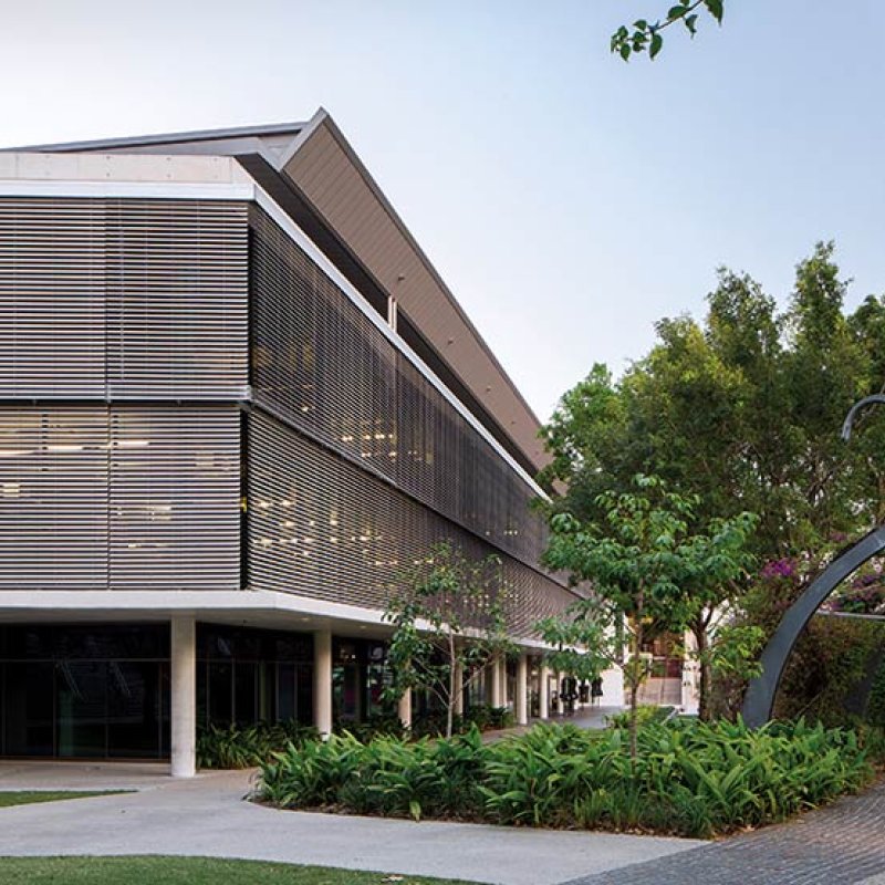 The distinctive steel cladding that dances its way along the northern and western facades of the building is part of the language of layered shading that is common parlance in tropical architecture.
