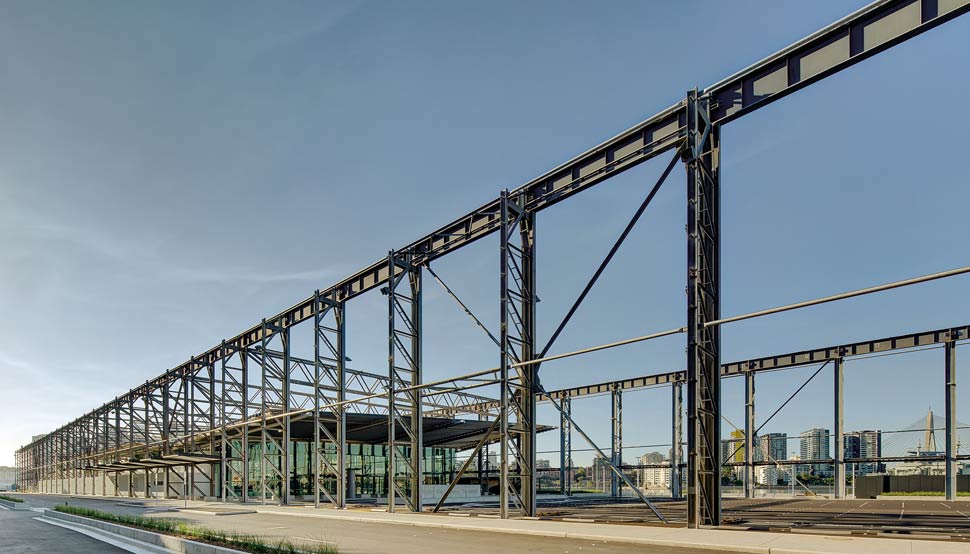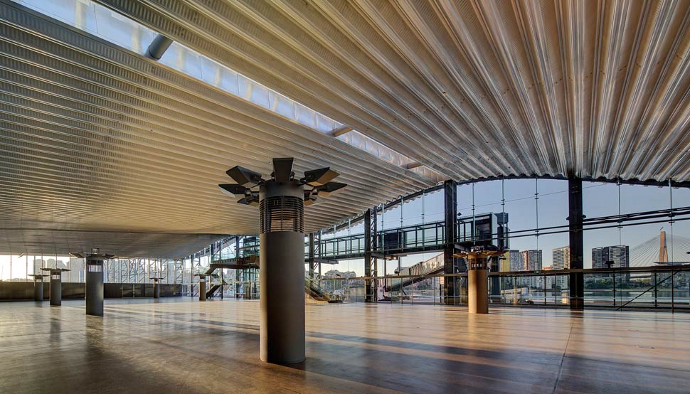 van Ratingen and his colleagues convinced their client – Sydney Ports – to incorporate parts of the gantry into the new building. Their concept aimed to drape a new metal roof between the two rows of columns, anchor the building back into the cliff with a series of amenities pods, and open up to the harbour views with full-height glass walls on three sides.