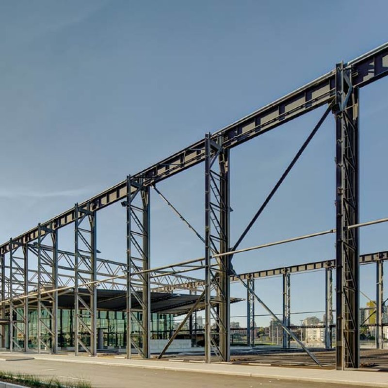 Working with structural engineers, the architects explored several options before settling on a roof structure of curved tubular steel trusses and purlins made from BlueScope steel. These span the gantry columns, with the roof sheeting suspended below them.